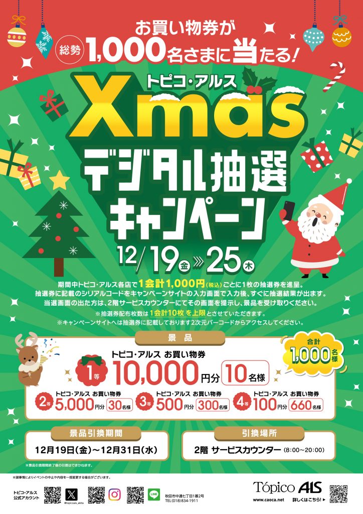 期間中、トピコ・アルス各店で1会計1,000円(税込)ごとのお買い物で1枚抽選券をお渡しします(1会計のお渡し上限10枚)