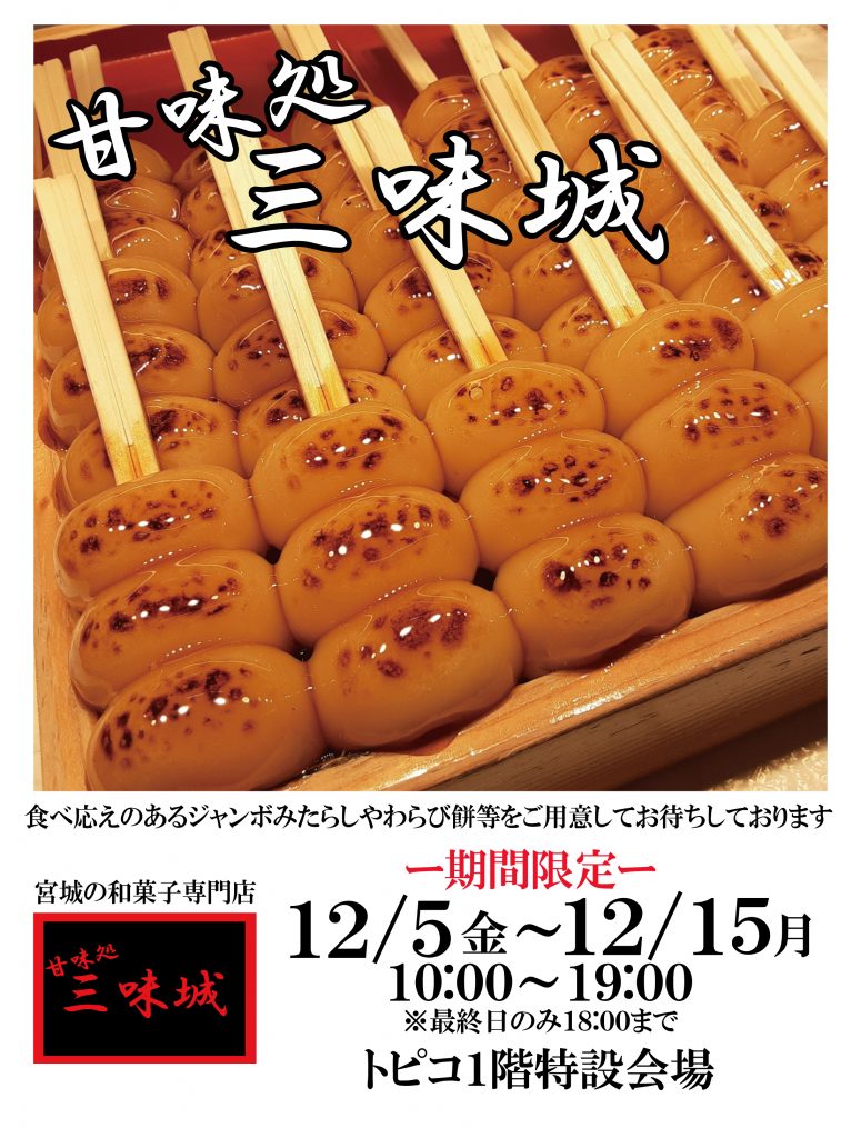 12/5㈮~12/15㈪期間限定OPEN!『三味城』 2025年12月3日 宮城の和菓子専門店『三味城』がトピコに再び登場! 食べ応えのあるジャンボみたらしやわらび餅等、 人気の和菓子を種類豊富にご用意して 皆様のお越しをお待ちしております! ホームイベントニュース 12/5㈮~12/15㈪期間限定OPEN!『三味城』